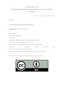 Nell'ultimo periodo l'opinione pubblica è divisa sull'esistenza o la non esistenza della cancel culture, e se questa sia giusta o sbagliata. È giusto abbattere le statue di Colombo e di Da Gama perché simboli del colonialismo? O, in quanto ormai fanno parte della nostra storia, sono 'intoccabili', benché responsabili di stragi e genocidi? È giusto eliminare parti di storia. Se il dibattito pubblico purtroppo spesso si arresta a considerazioni alquanto banali, la discussione sul dibattito è interessante anche dal punto di vista etico, e nel paper presente si tenta di individuare ciò che va bene della cancel culture e ciò che invece non va bene, nonché di analizzare alcune 'strade' e possibili soluzioni ai problemi presenti e a ciò che non va bene.