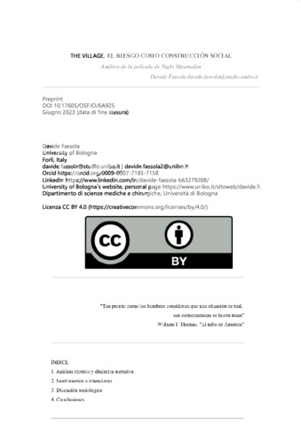 Este artículo propone una lectura sociológica de la película The Village (2004) de M. Night Shyamalan, interpretando el riesgo como una construcción social. A través del análisis narrativo, simbólico y político del film, se argumenta que el miedo colectivo puede ser fabricado y manipulado por actores sociales con fines de control. El pueblo aislado representa una metáfora de sociedades contemporáneas que externalizan el peligro y crean normas para legitimar el aislamiento y la protección. El texto dialoga con teorías de autores como Ulrich Beck, David Le Breton y Mary Douglas, mostrando cómo el riesgo no es un dato objetivo, sino una representación social que varía según el contexto histórico, político y cultural. La película se convierte así en una crítica al proteccionismo, la manipulación del miedo y la fragilidad de las construcciones sociales frente a la realidad.
